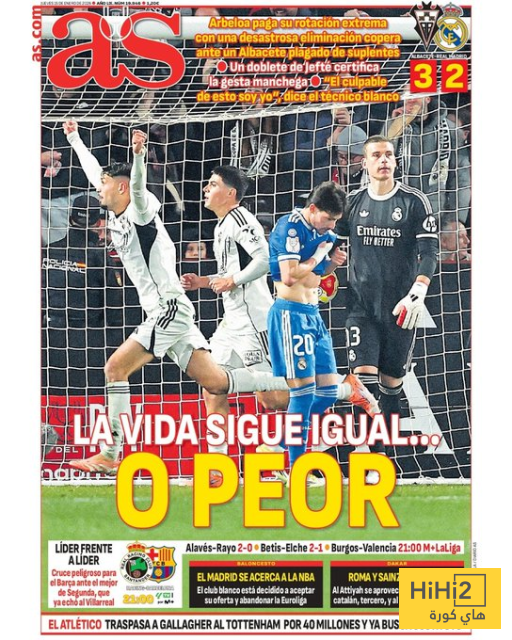 - سلطت صحيفة أس الاسبانية الضوء على هزيمة الريال ضد ألباسيتي والاقصاء من بطولة كأس ملك اسبانيا من دور الـ 16 . غلاف الأس اليوم الخميس 15 يناير 2026: ” الحياة تستمر كما هي أو ربما أسوأ “ “اربيلوا يدفع ثمن تدويره المفرط بخروج كارثي من كأس الملك أمام ألباسيتي الملئ باللاعبين الاحتياطيين “ […]